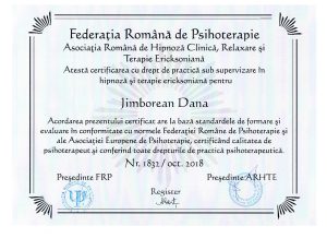 Sunt psihoterapeut automon acreditat de catre Colegiuk Psihologilor din Romania (2016) in Psihoterapie Ericksoniana, Hipnoza Clinica si Tehnici de relaxare si Mindfulness.