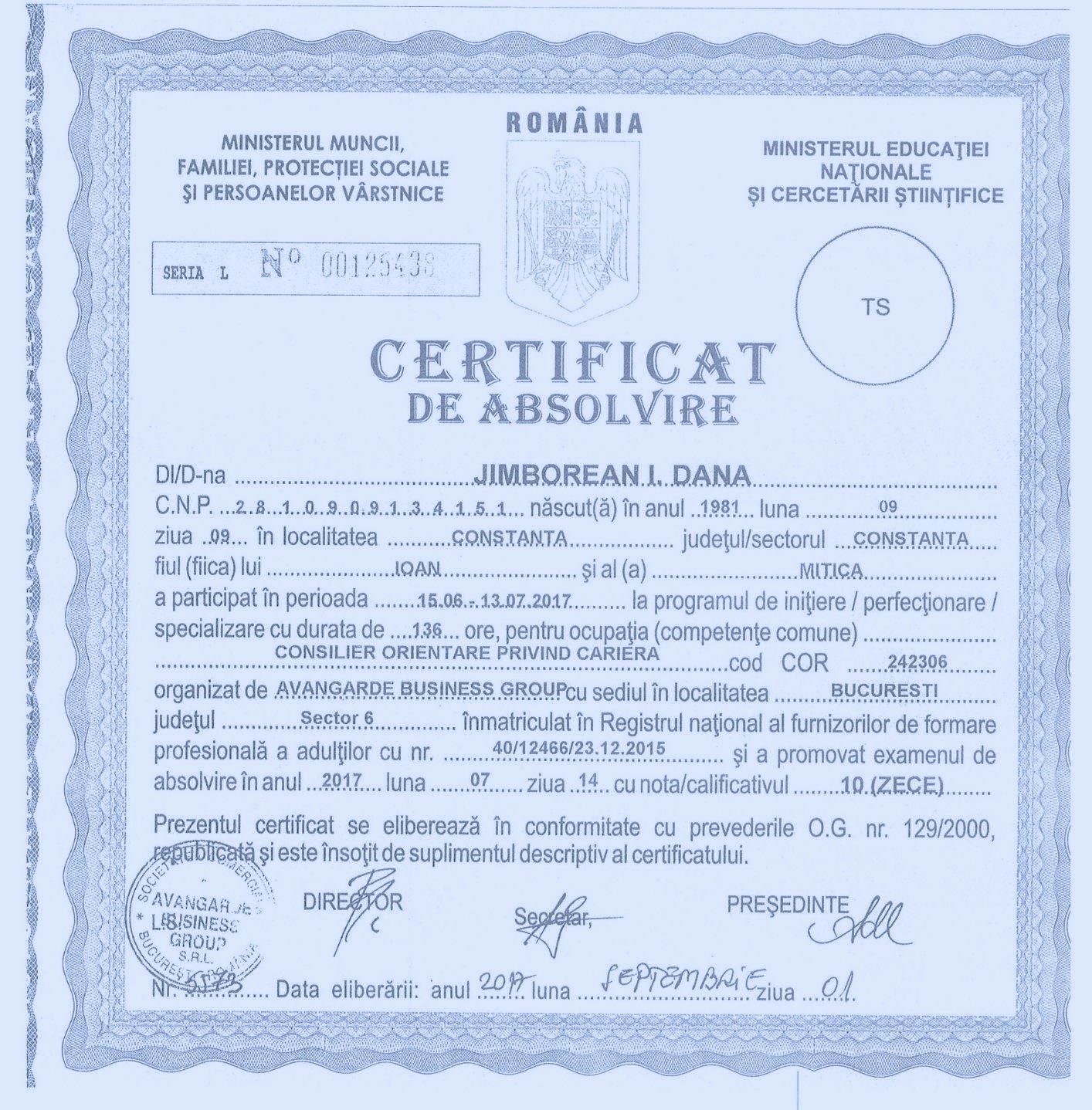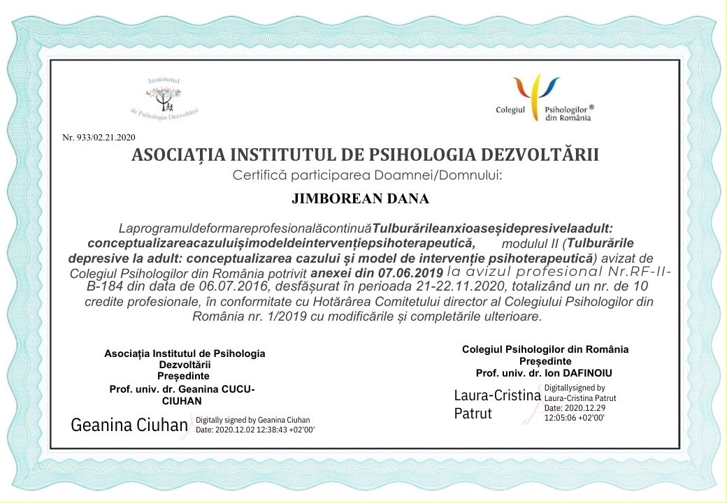 Eliberat de Colegiul Psihologilor in Romania