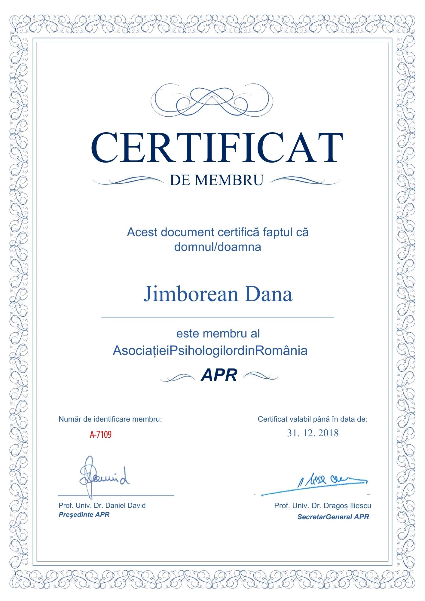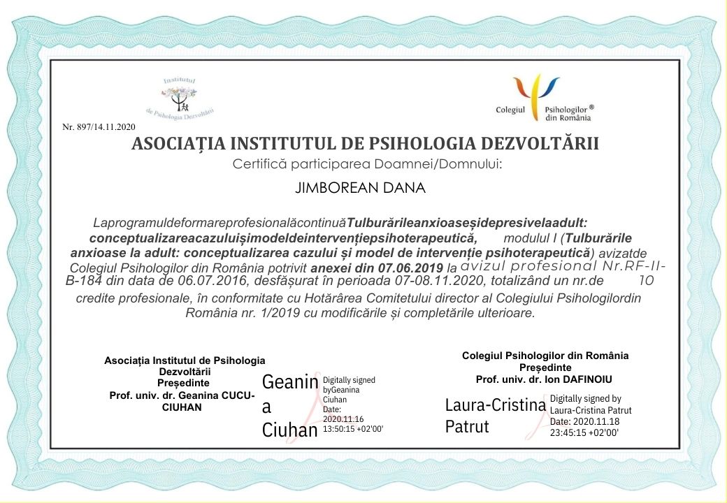 - Membru al Consiliului Psihologilor din Romania – cod personal: 19541